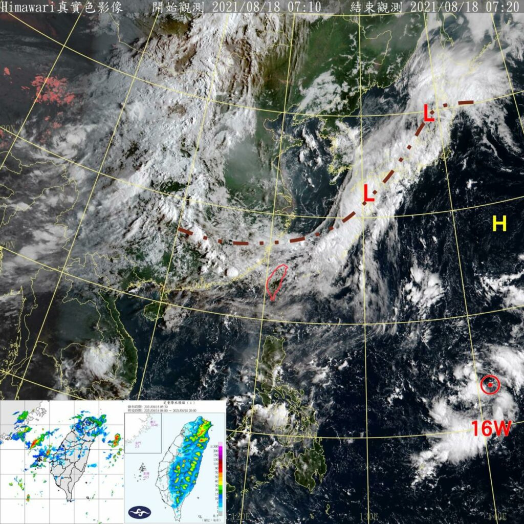 (廖璟萓/綜合報導)今天(18日)鋒面逼近台灣北部海面,天氣將變更不穩定,各地午後都有局部較大雨勢發生的機率,氣象局表示此鋒面型態偏向「滯留鋒」,在8月算是少見,明天(19日)午後雷陣雨的範圍將更大;另外,位於關島的熱帶低壓,路徑預測大轉彎,預估周五開始北轉,威脅度將降低,是否增強為今年第12號颱風「奧麥斯」,以及對台灣的影響將持續觀察。